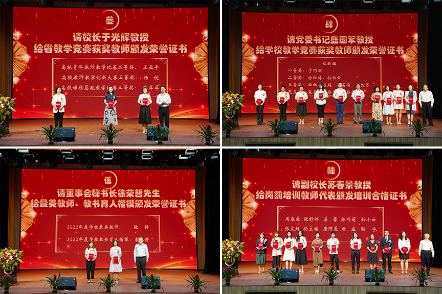 于光輝校長為榮獲山東省教學競賽的獲獎教師頒發(fā)榮譽證書;盛國軍書記為學校教學競賽獲獎教師頒發(fā)榮譽證書;徐榮哲秘書長為學校最美教師、教書育人楷模頒發(fā)榮譽證書;蘇春景副校長為崗前培訓教師代表頒發(fā)培訓合格證書。