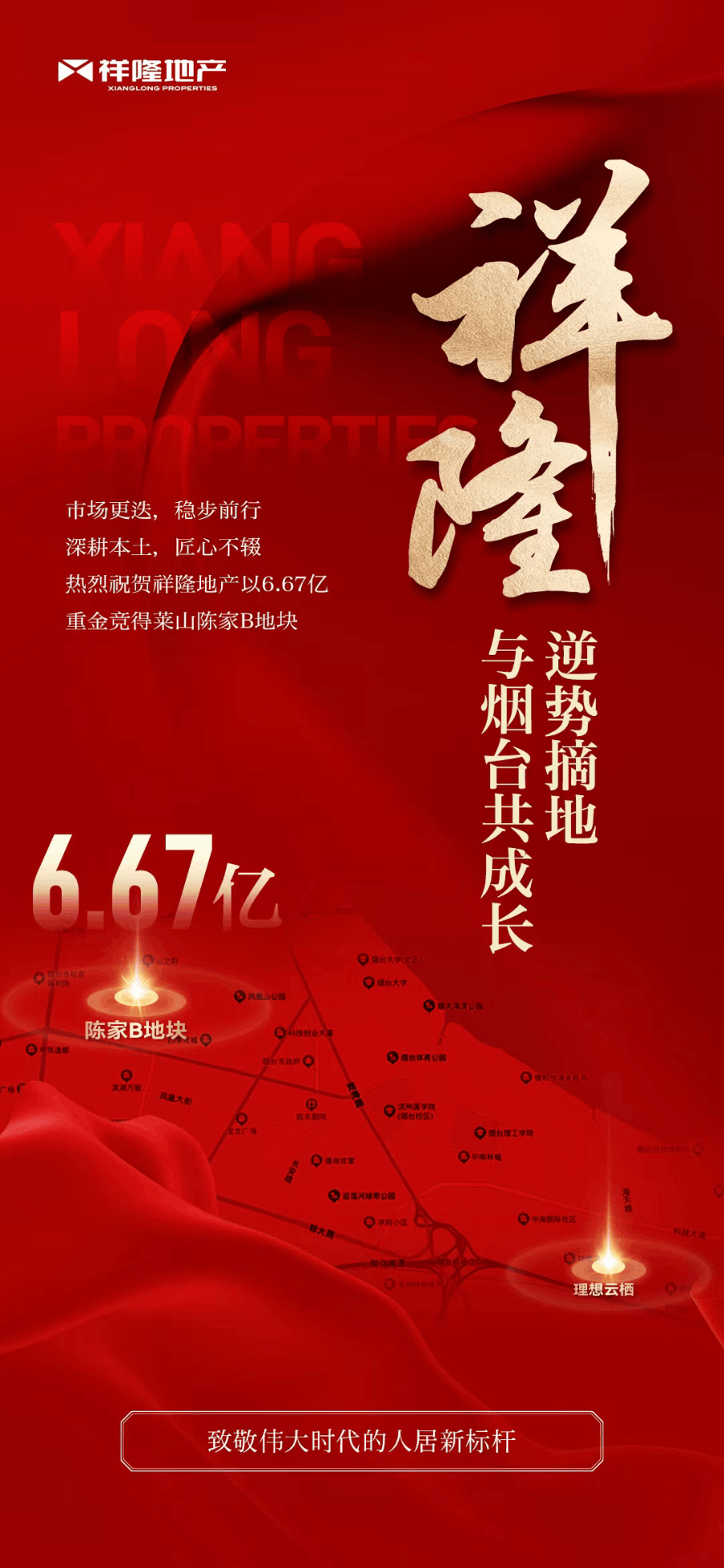 在市場(chǎng)行情入冬的情況下,在11月16日司慶同日,祥隆地產(chǎn)在煙臺(tái)東部區(qū)域以總價(jià)6.67億元成功斬獲新地塊,為祥隆企業(yè)集團(tuán)28歲生日慶生,在恢弘版圖上再添璀璨一筆!