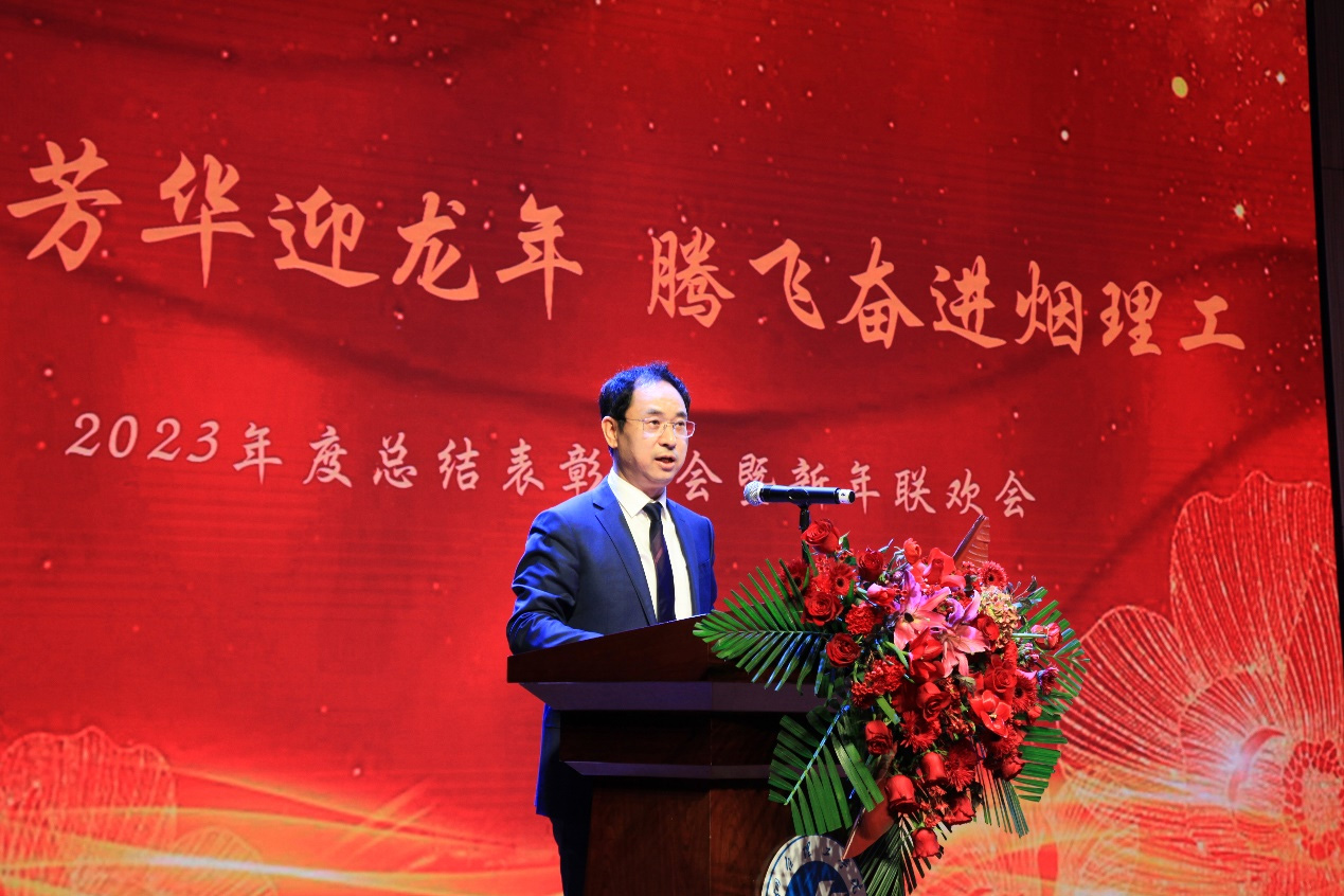 廿載芳華迎龍年,騰飛奮進(jìn)煙理工。2024年1月16日下午2:00,煙臺理工學(xué)院2023年度總結(jié)表彰大會暨新年聯(lián)歡會在綜合樓一樓多功能廳隆重舉行。祥隆企業(yè)集團(tuán)董事長、煙臺理工學(xué)院董事長辛軍,集團(tuán)副總裁、學(xué)院董事會秘書長徐榮哲,煙臺理工學(xué)院校長于光輝,黨委書記盛國軍及全體校領(lǐng)導(dǎo)與教職員工歡聚一堂,共迎新年。
