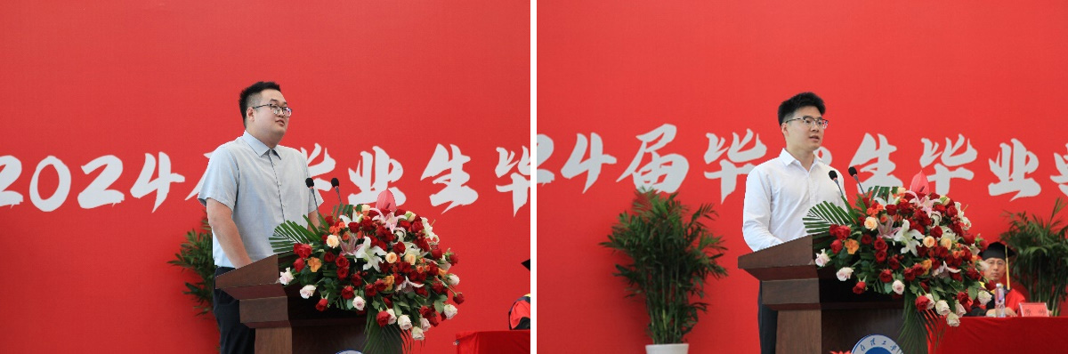 教師代表外國(guó)語(yǔ)學(xué)院徐家南、畢業(yè)生代表人工智能學(xué)院丁天舉分別上臺(tái)并發(fā)言。優(yōu)秀畢業(yè)生代表向老師敬獻(xiàn)鮮花以表師恩難忘。