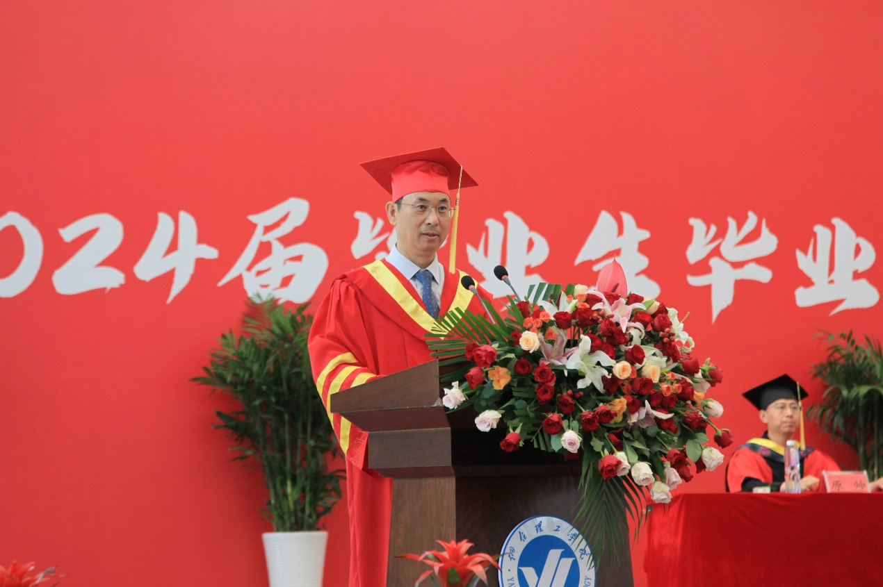 大會(huì)最后,煙臺(tái)理工學(xué)院校長(zhǎng)于光輝發(fā)表了講話(huà)。于校長(zhǎng)首先代表學(xué)校向圓滿(mǎn)完成學(xué)業(yè)的畢業(yè)生表示衷心祝賀,感謝2024屆本科畢業(yè)生在四年的時(shí)光中,陪伴煙臺(tái)理工學(xué)院共同成長(zhǎng)進(jìn)步。期望同學(xué)們?cè)谖磥?lái)的生活中秉持“和合”精神,學(xué)會(huì)溝通合作;永葆熱愛(ài),心懷家國(guó);心懷勇氣,不懈拼搏,奔赴星辰大海。